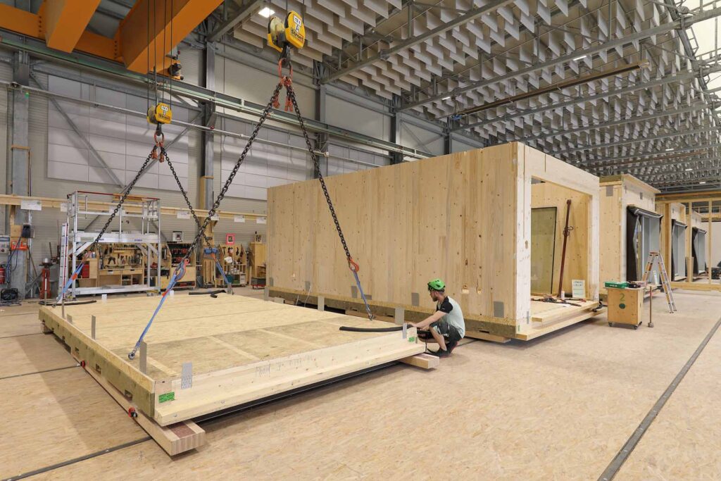 Dank unserer industriellen Vorfertigung in einer modernen, wetterunabhängigen Produktionshalle entstehen Module, die bereits zu 95 % ausgestattet sind – inklusive Gebäudetechnik, Innenausbau und Fassade. Das ermöglicht kurze Bauzeiten, höchste Qualität und maximale Planbarkeit. Von der ersten Idee bis zur schlüsselfertigen Übergabe erhalten unsere Kunden alles aus einem Haus – geplant, produziert und umgesetzt mit Präzision und Leidenschaft für den Werkstoff Holz.