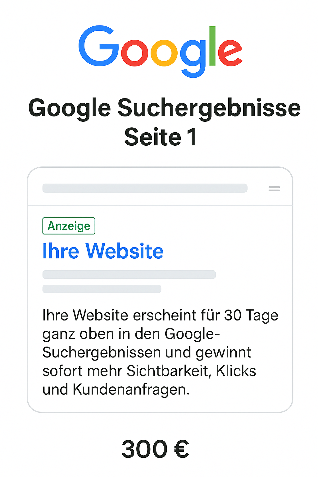 Mit „Google Suchergebnisse – Seite 1“ sichern Sie Ihrem Unternehmen eine sichtbare Platzierung bei Google. Für 30 Tage erscheinen Sie ganz oben in den relevanten Suchergebnissen und erreichen sofort mehr Aufmerksamkeit, Klicks und Kundenanfragen.